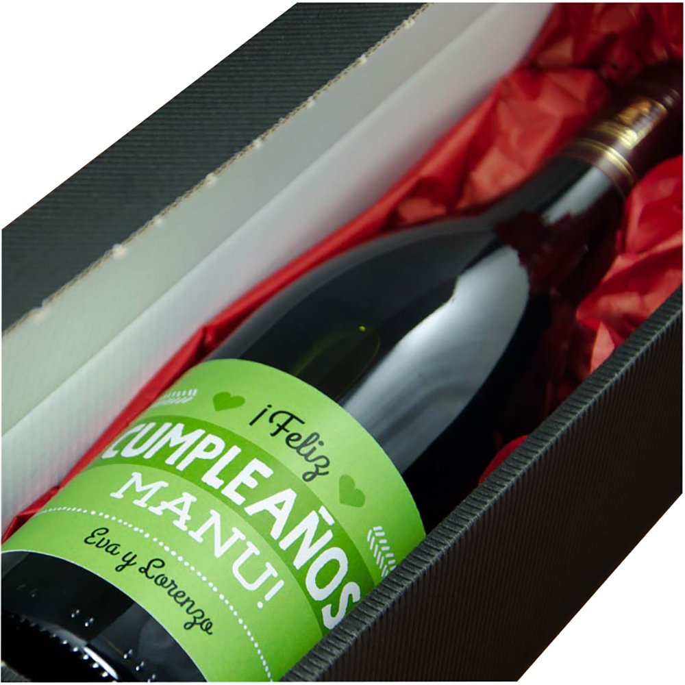 Botella de vino 'feliz cumpleaños' personalizada con el nombre del cumpleañero y tu firma.