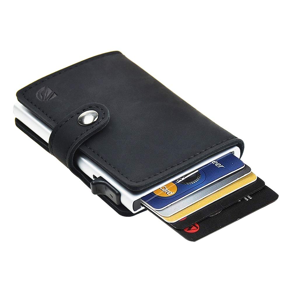 Delgado y Agradable: solo 16 mm plano. El diseño delgado de moda hace que el titular de la tarjeta se vea más elegante y vintage. Incluye un compartimiento de caja de metal con un botón emergente que puede contener de 5 a 6 tarjetas, además de 2 bolsillos adicionales en la billetera que podrían usarse para otras tarjetas (licencia de conducir, tarjeta de seguro, etc.) y un compartimento para guardar poco efectivo o facturas ¡Esta pequeña billetera tiene todo lo que necesitas